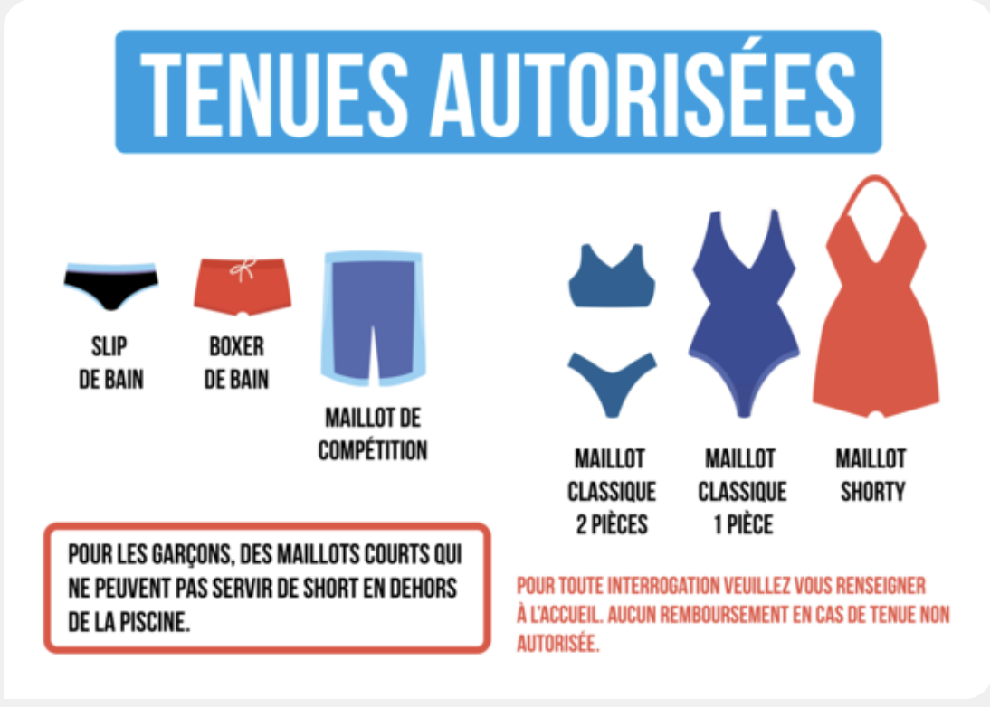 À l’entrée des piscines municipales, des panneaux affichent clairement les restrictions vestimentaires, justifiées par des règles d’hygiène. Des dessins de maillots dits “conformes” représentés précisant que toute tenue de ville est interdite dans les espaces de bains. Pour les femmes, seuls les maillots “classiques” sont admis : une pièce sans manches, au-dessus du genou, ou un deux-pièces standard et dernièrement les maillots intégrés d’un « shorty »